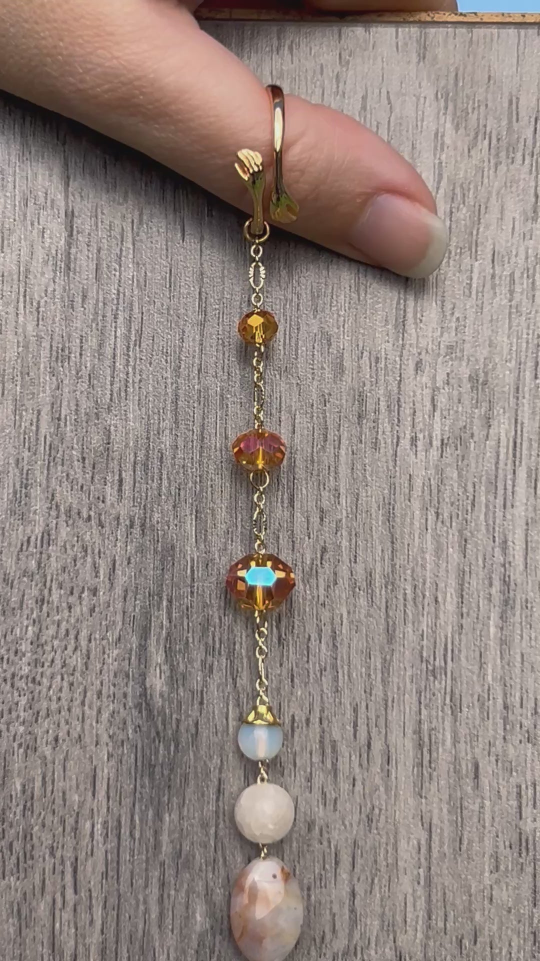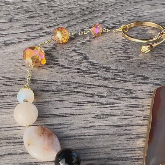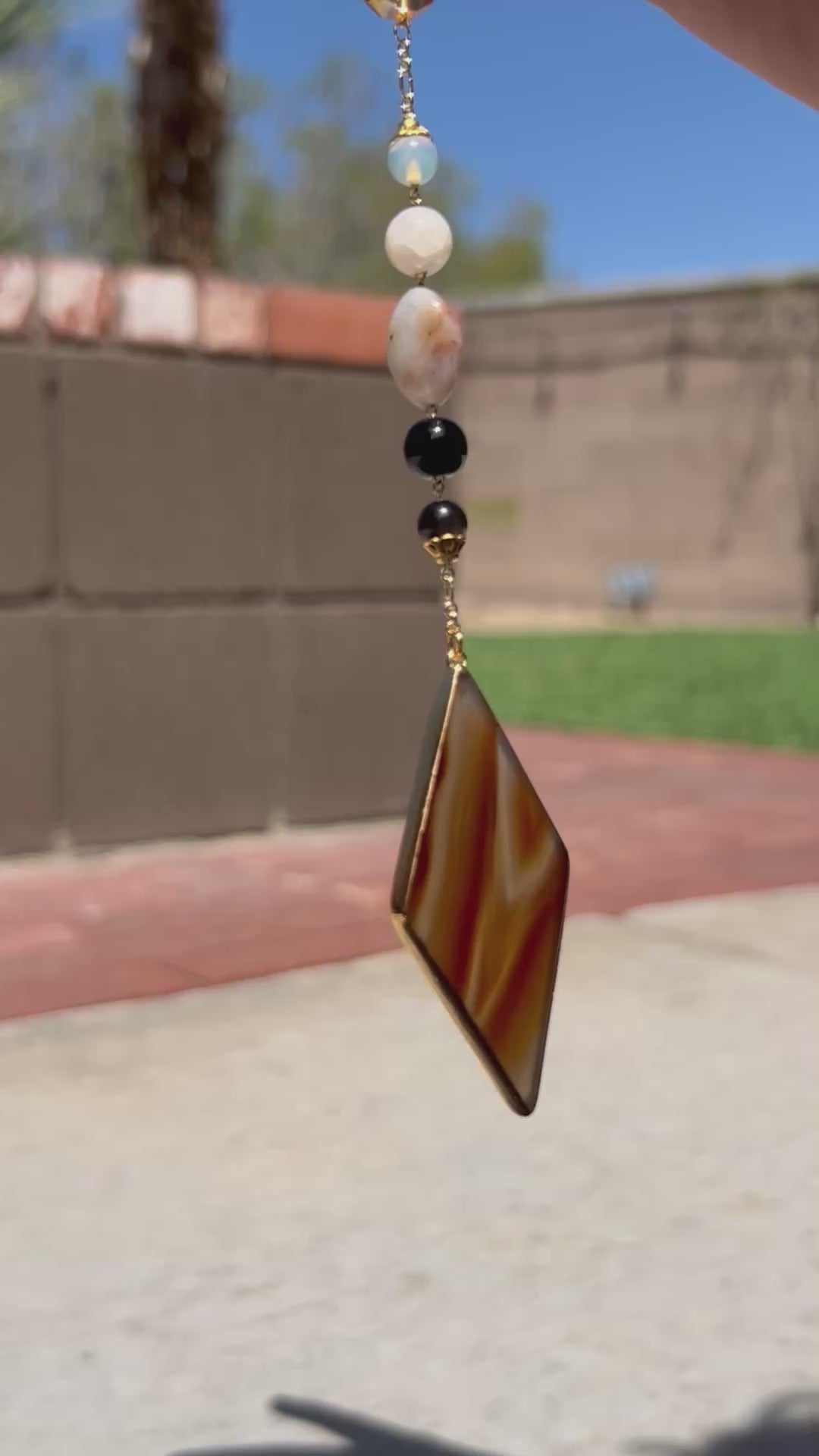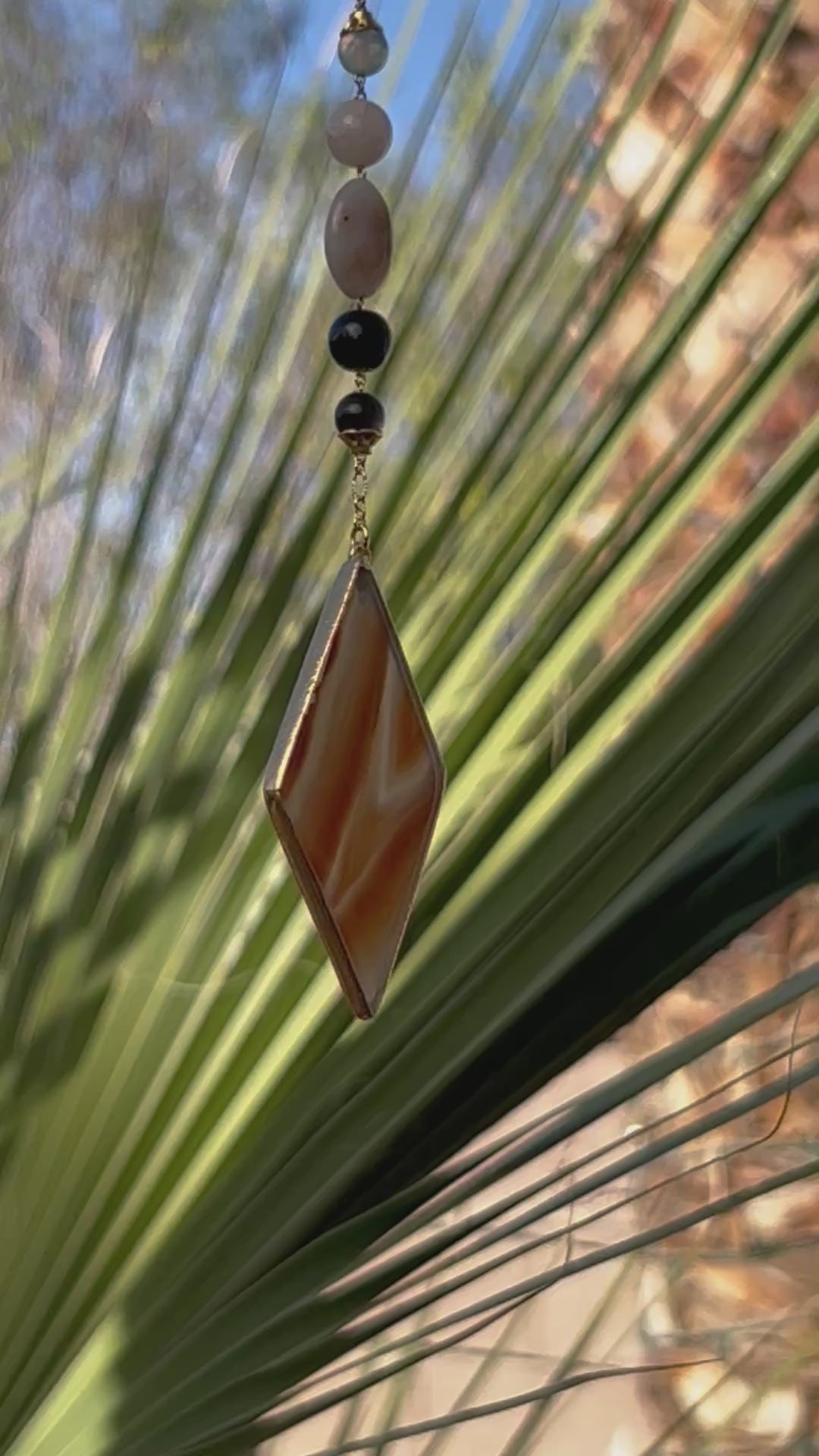 Elegant and earthy. This piece has onyx and obsidian at the bottom to adsorb negative energies, protect, and transmute into the light where the moss agate acts as a bridge and transitions to the light with the quartz and Opalite.