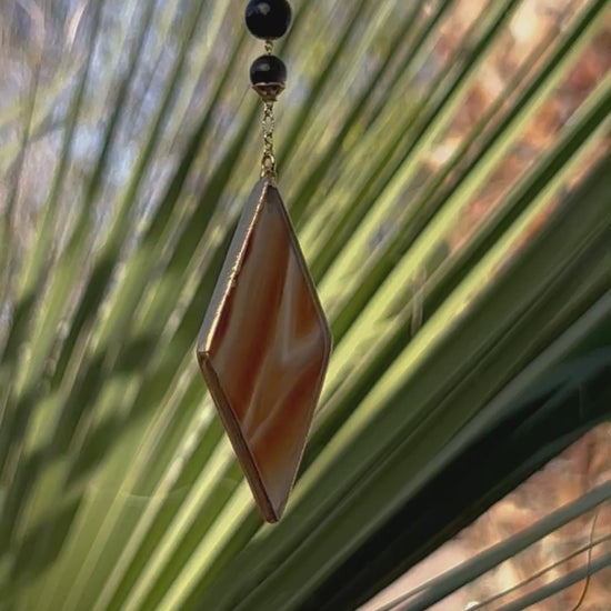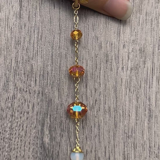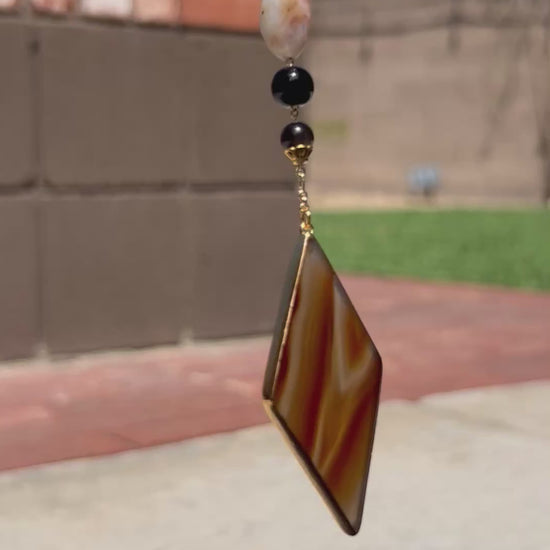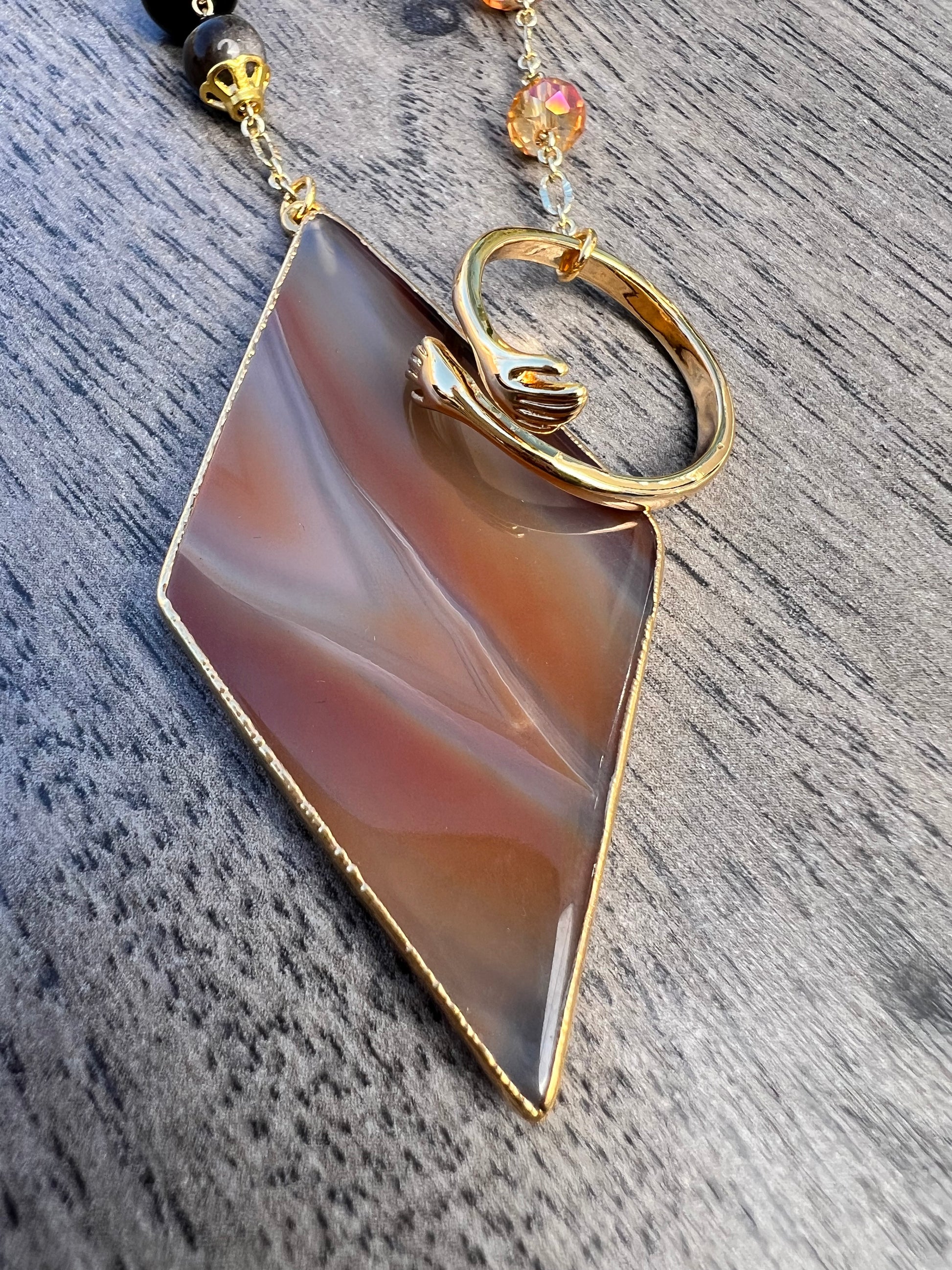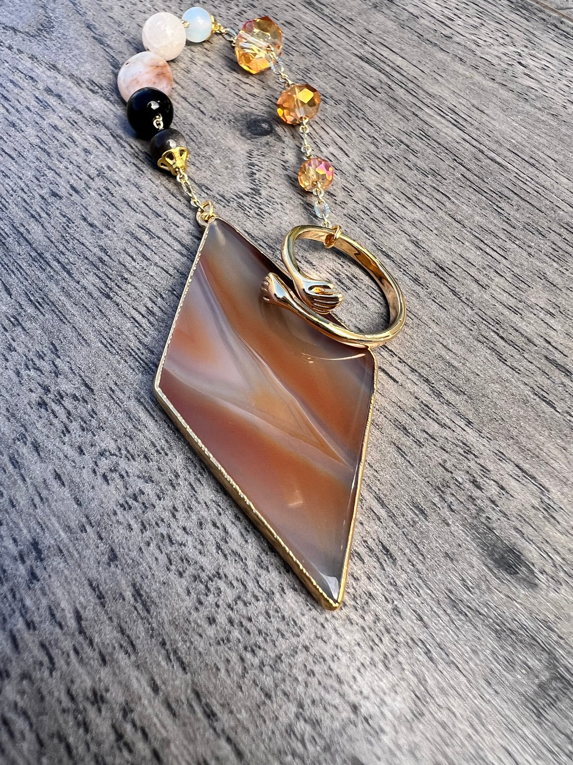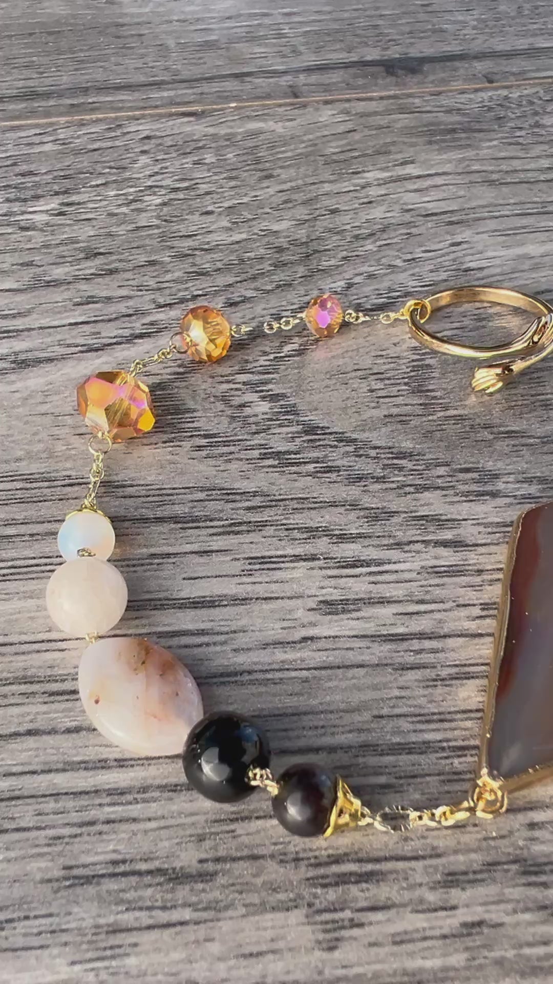 Elegant and earthy. This piece has onyx and obsidian at the bottom to adsorb negative energies, protect, and transmute into the light where the moss agate acts as a bridge and transitions to the light with the quartz and Opalite.